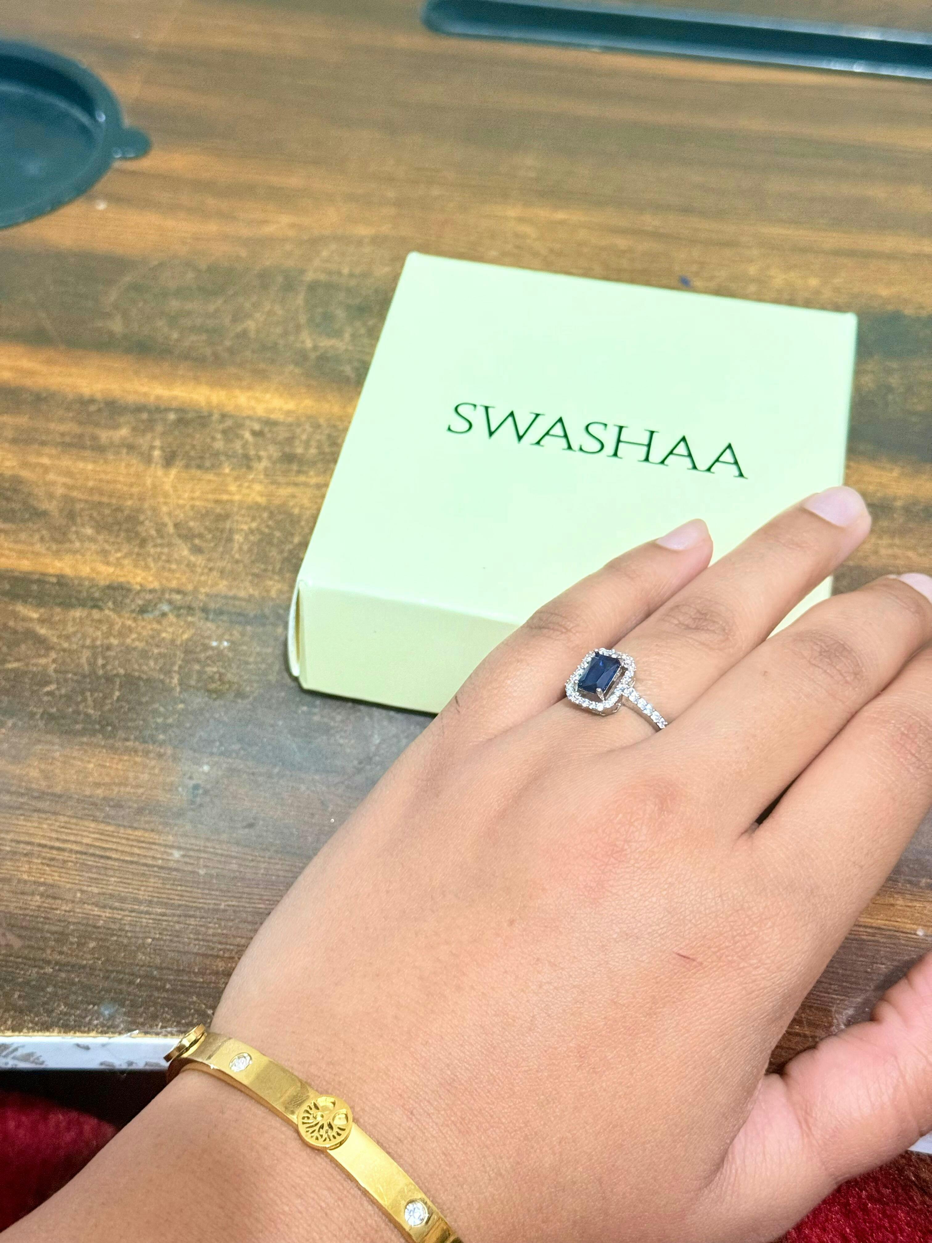Silver-tone open ring featuring a radiant blue rectangular stone framed by pave CZ halo and band detailing. Bold, luminous, and designed for statement moments.