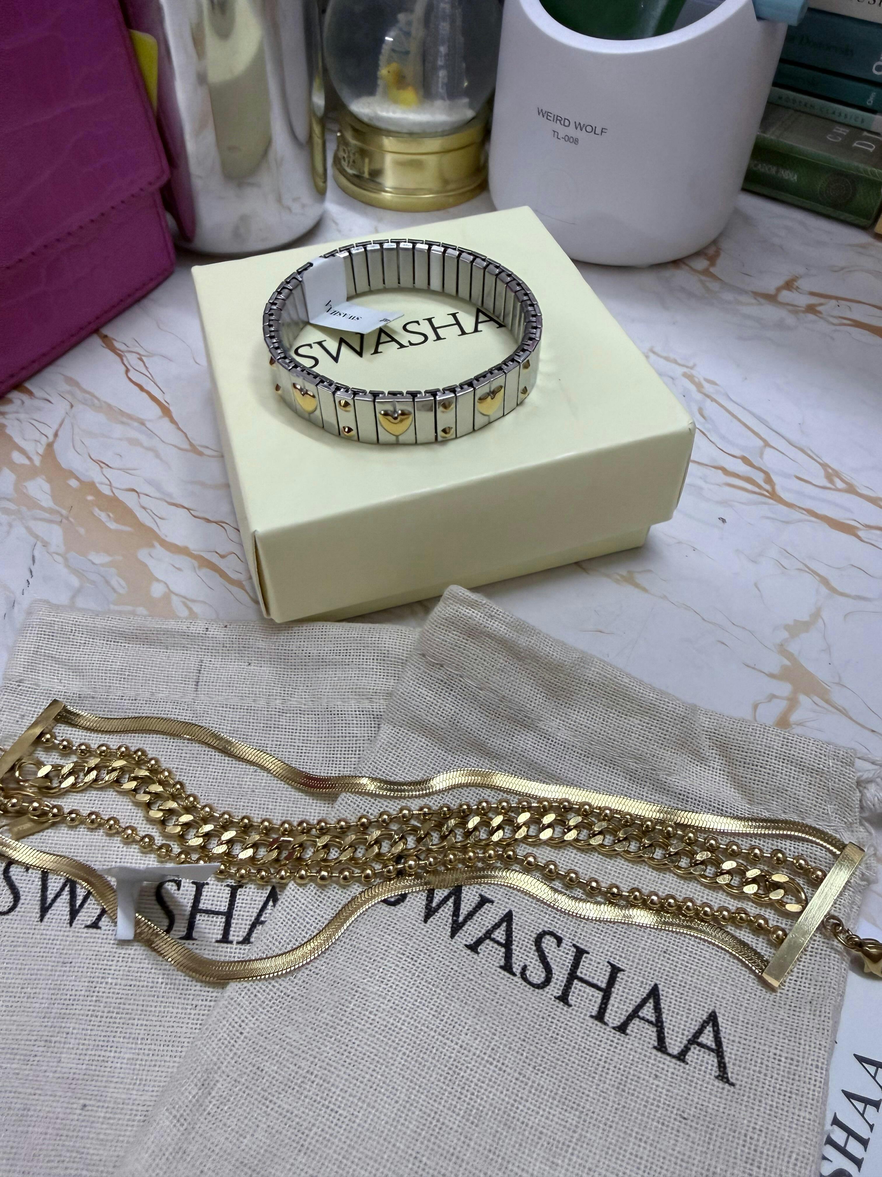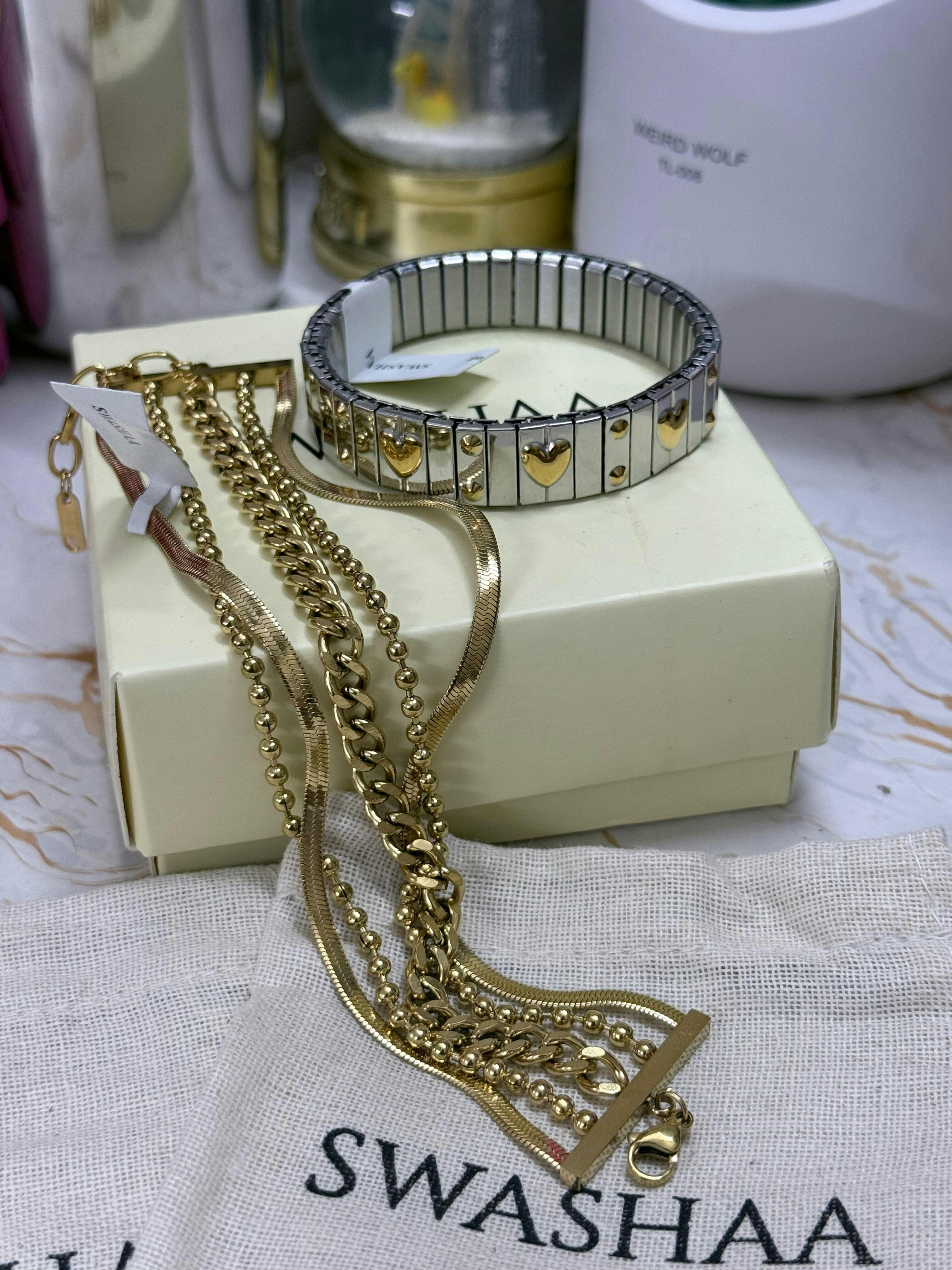 Gold-plated bracelet featuring layered snake and link chains framed in a sleek rectangular bar design. Completed with a lobster clasp and extender chain - bold, structured, and made to turn heads.