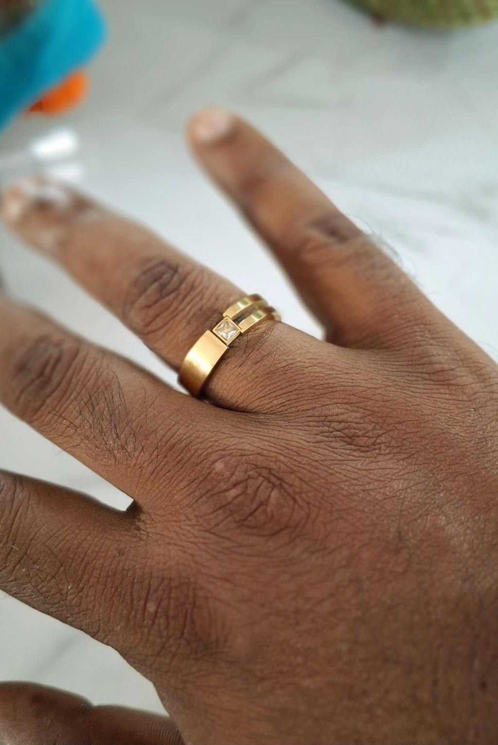 Modern gold-tone ring with a cutout band and a square-cut CZ centerpiece. Clean lines, sleek fit-your go-to for everyday minimal shine.