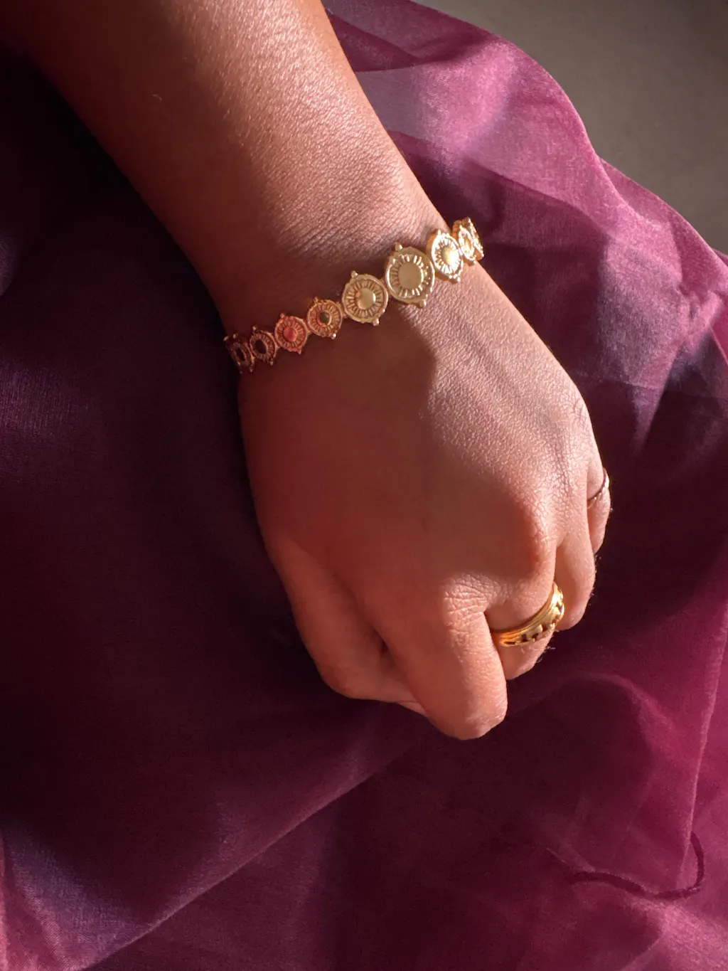 The Veda Circle Texture Bracelet is all about celebrating circles of different sizes and textures that come together to create an elegant and intriguing piece of wrist wear. It's a testament to the beauty of simplicity and the power of tactile design.