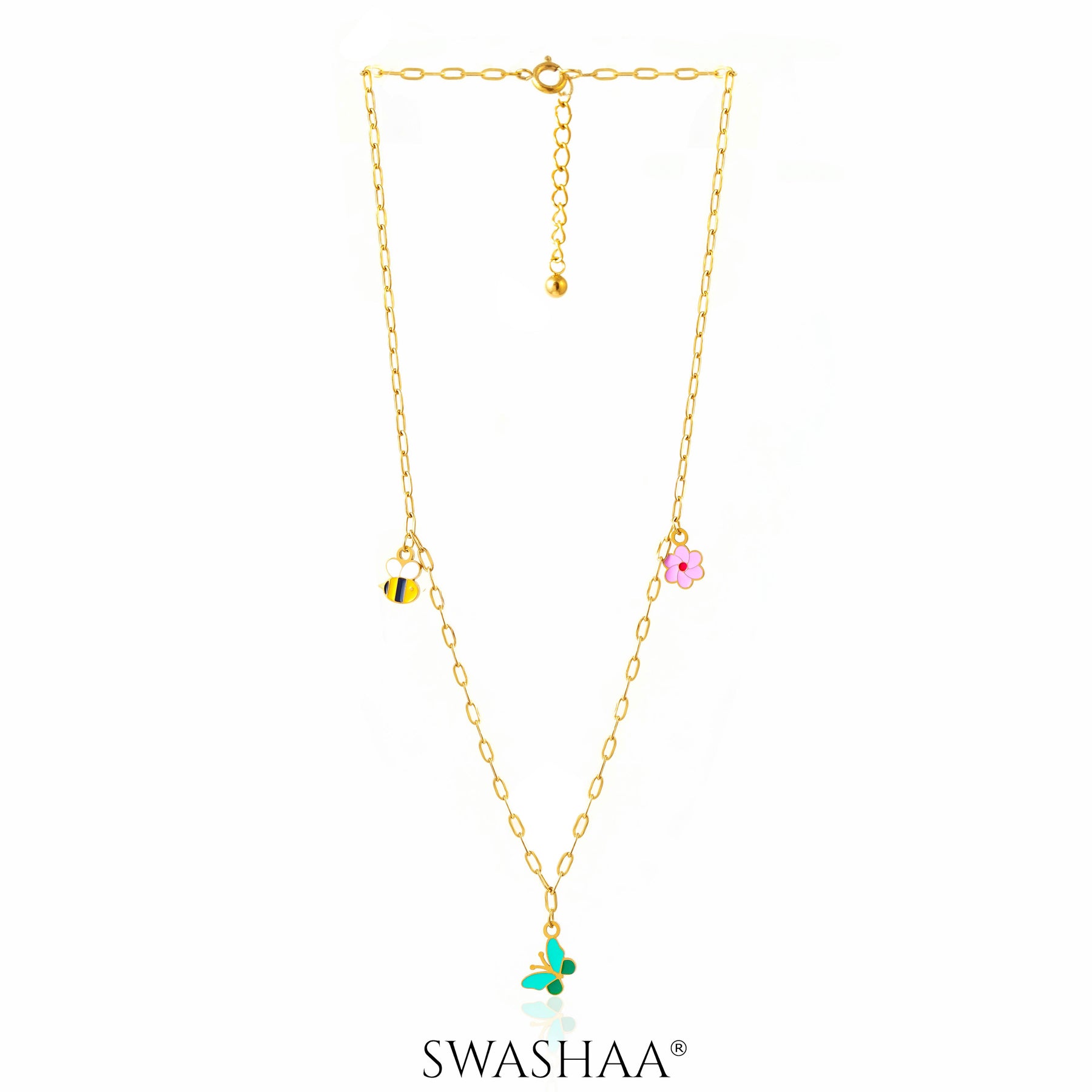 Gold-tone chain necklace adorned with a turquoise butterfly, buzzing bee, and pink flower charms. Playful, bright, and full of joy-perfect for your little one’s sunny days and cheerful adventures.