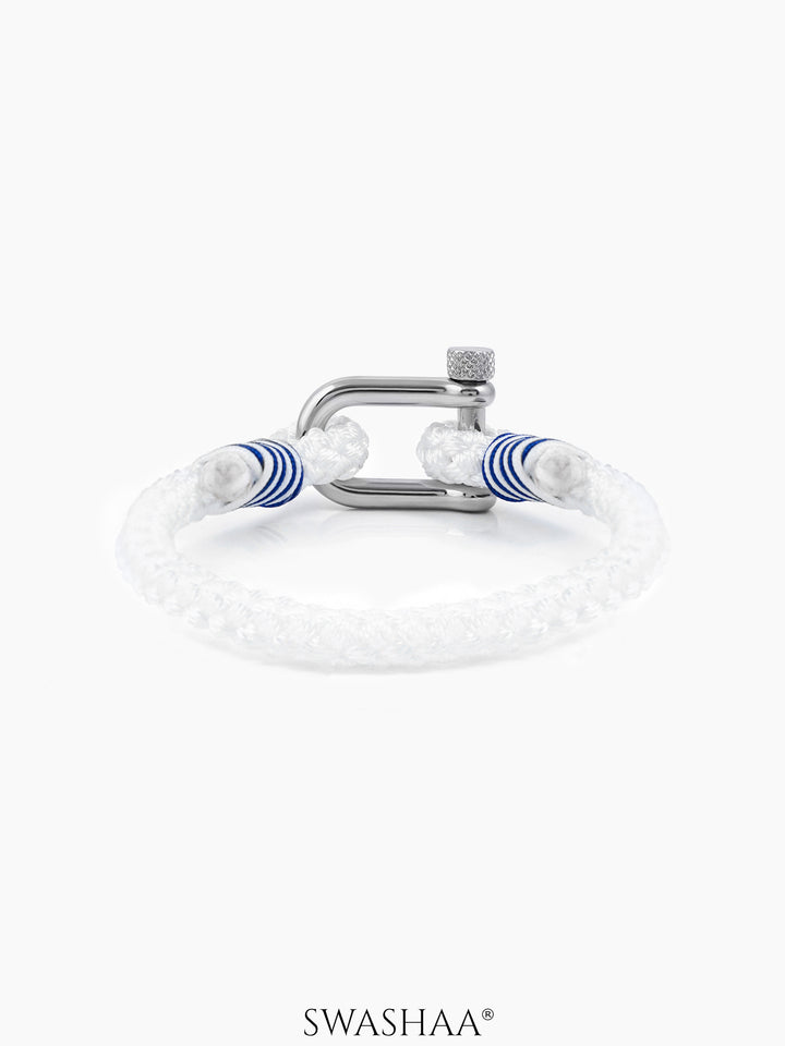 White woven rope bracelet with blue thread wraps, fastened by a sleek silver-toned shackle clasp. Fresh, nautical, and built for easy everyday wear.