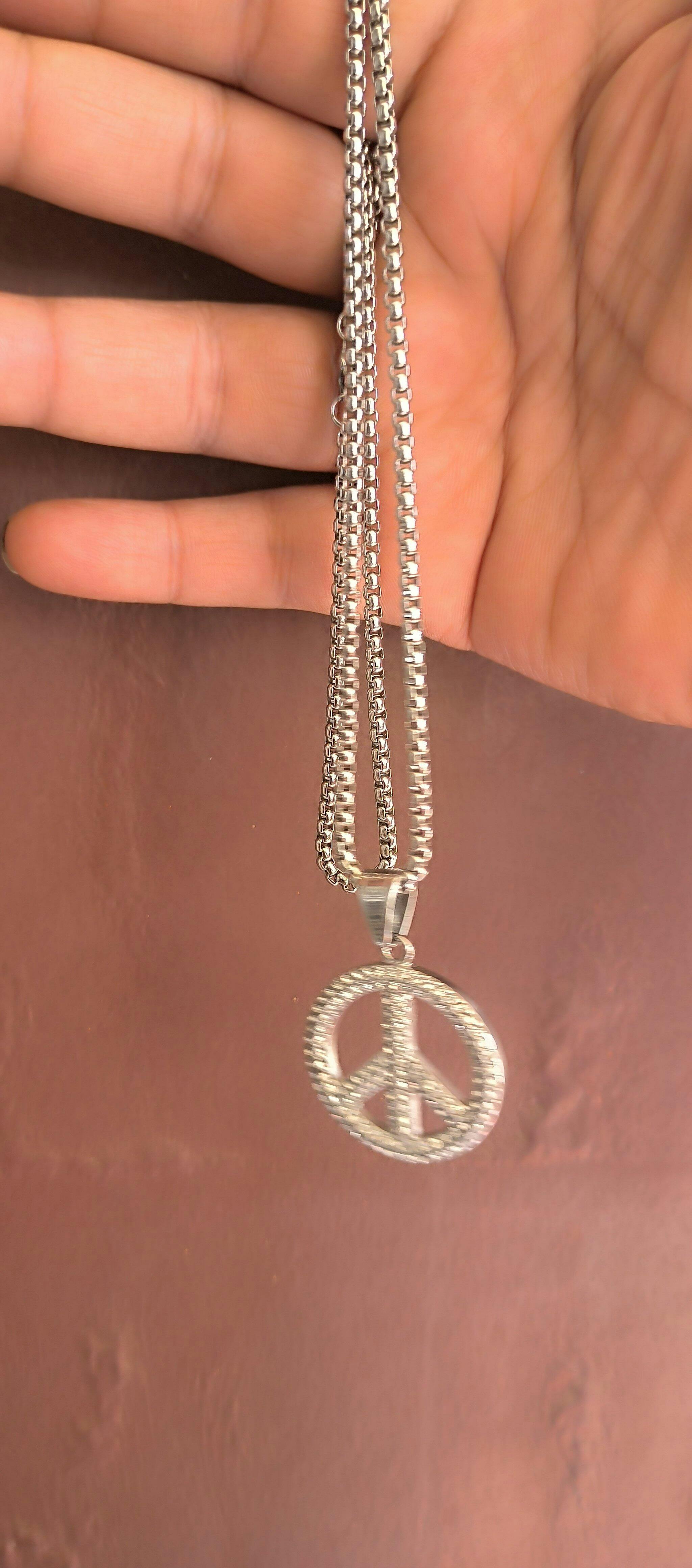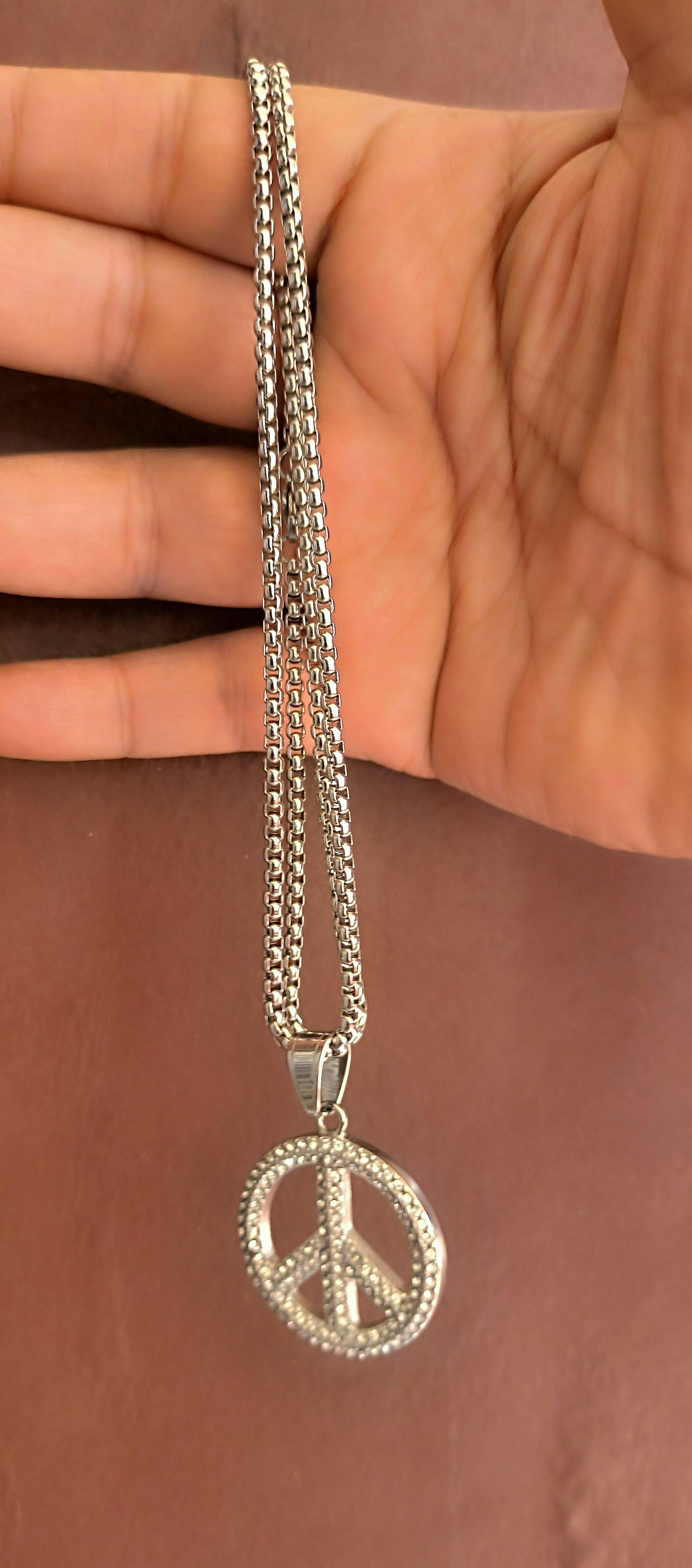 Crystal-studded peace sign pendant in gold and silver tones, suspended from a bold box chain. Light-catching, easygoing, and designed for everyday layering or solo vibes.