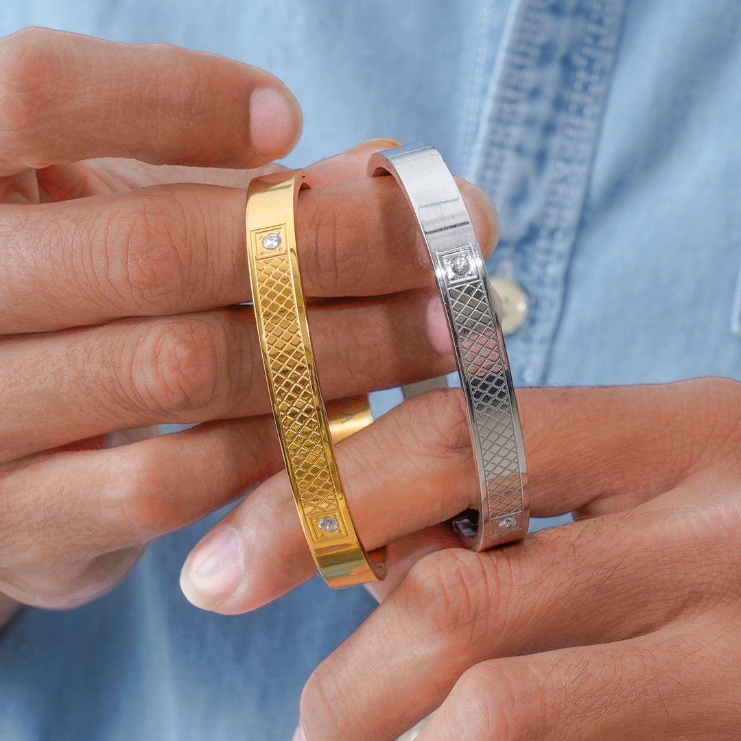 Brushed gold & silver kada set with etched diamond pattern and twin stone highlights. Slip-on ease with standout polish-everyday ready.