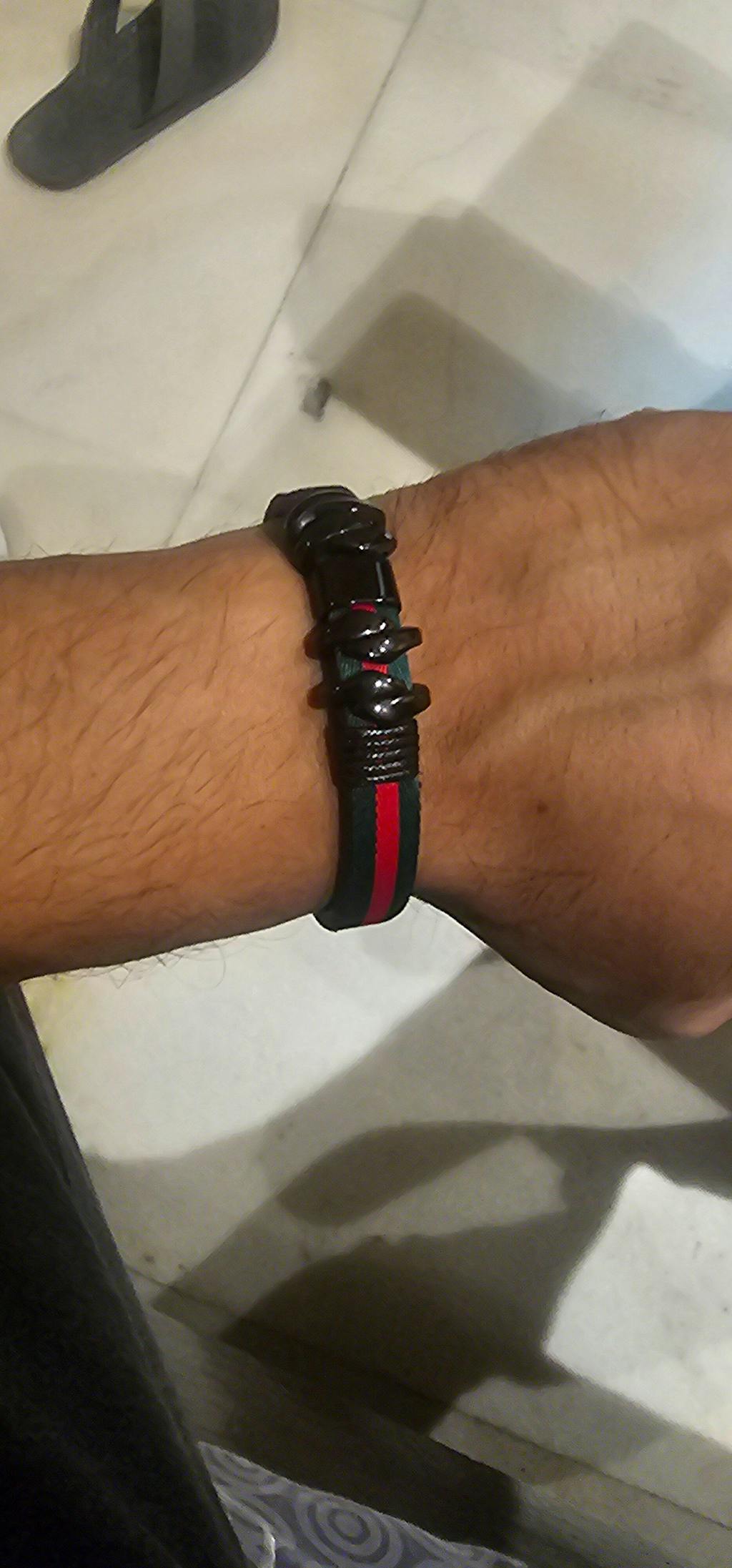 Green and red fabric strap layered on black leather, featuring bold black chain links at the center. Secured with a matte black buckle clasp. Striking, fearless, and made to flex with streetwear.