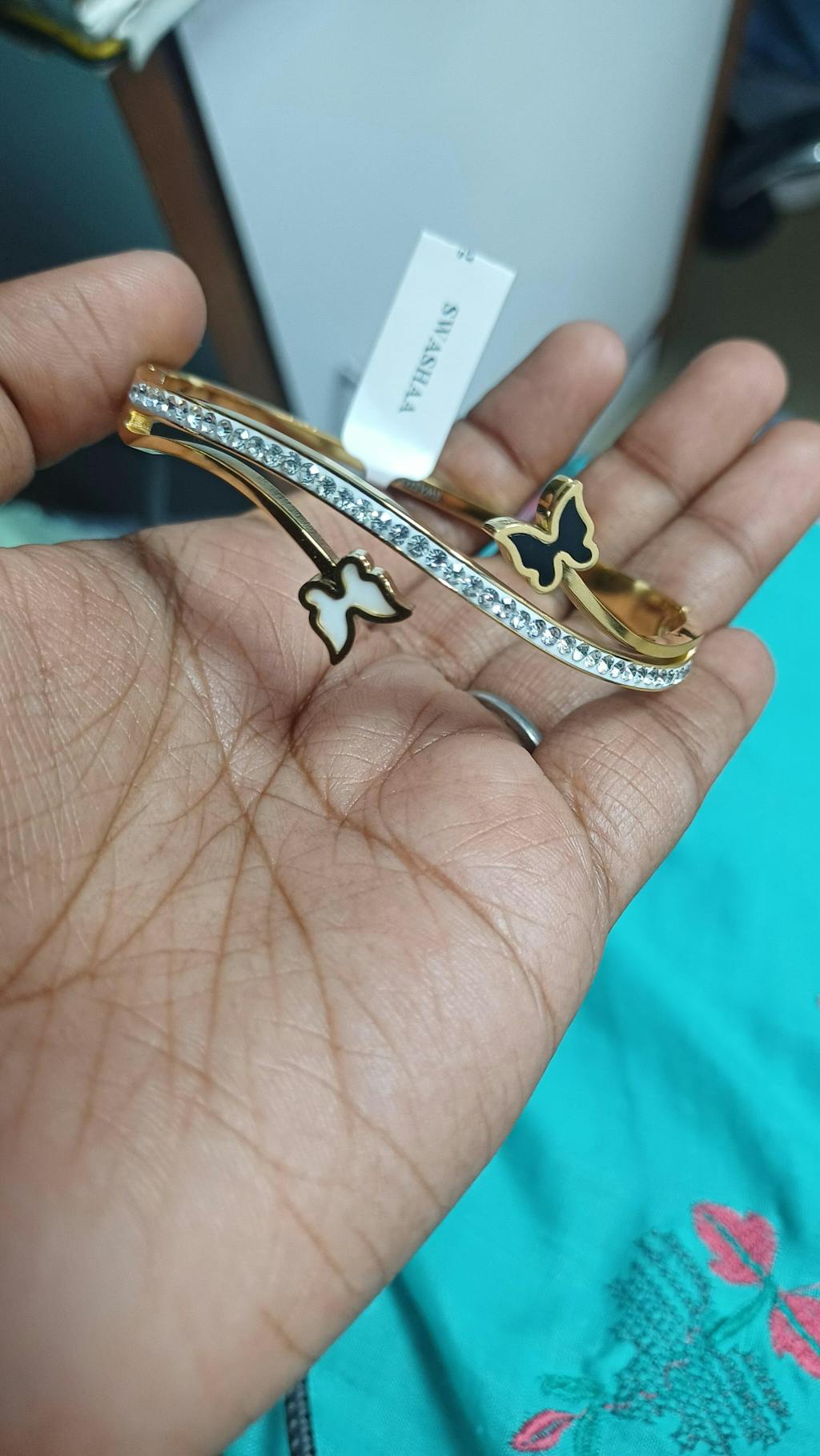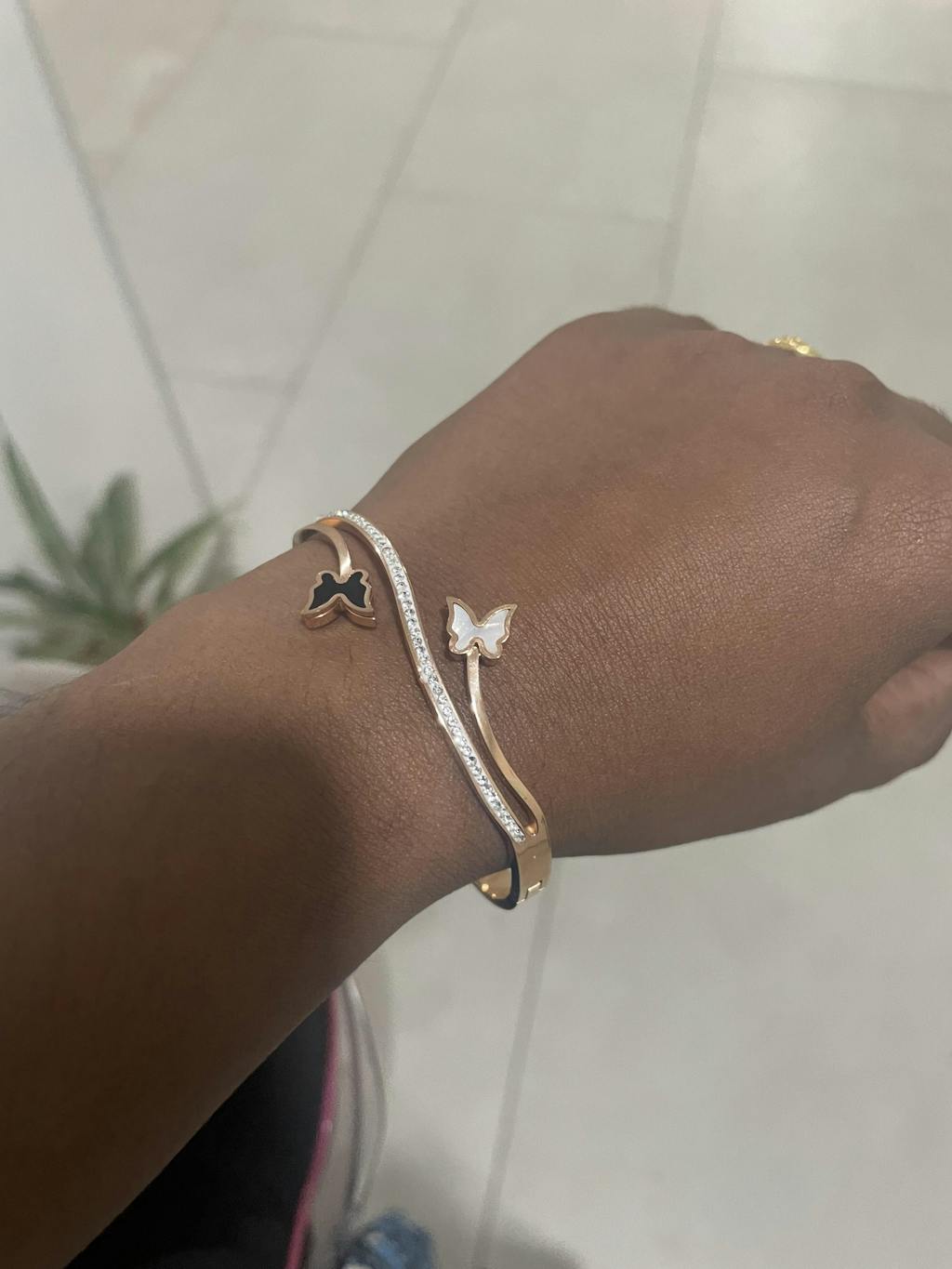 Gold-plated bracelet featuring dual enamel butterflies in black and white, perched along a line of shimmering CZ stones. Hinged clasp - graceful, symbolic, and made for everyday sparkle.