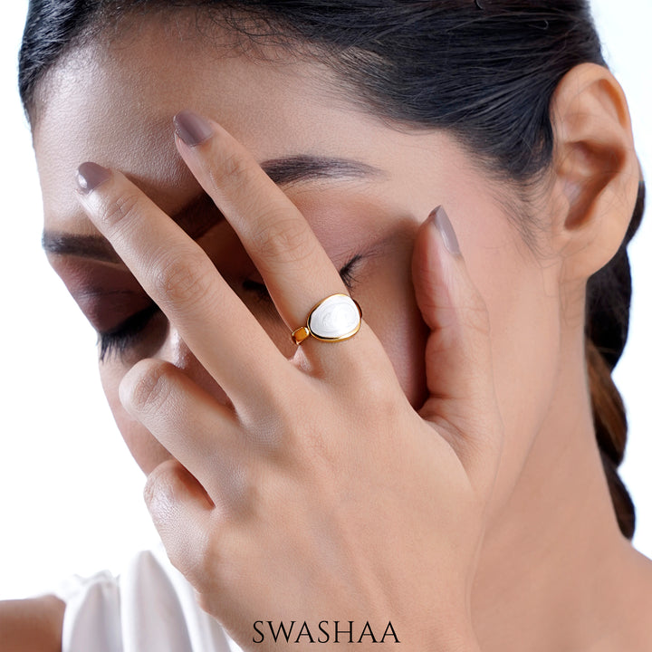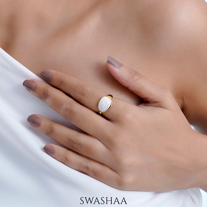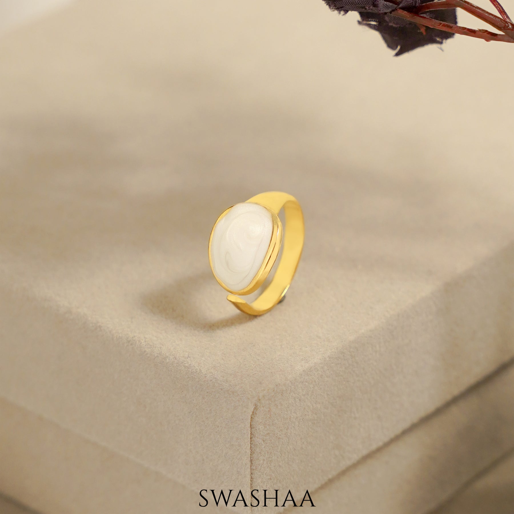 Gold-tone ring featuring a smooth oval white stone with subtle swirl textures. Minimal, refined, and effortlessly graceful.