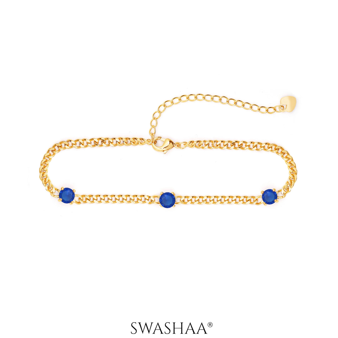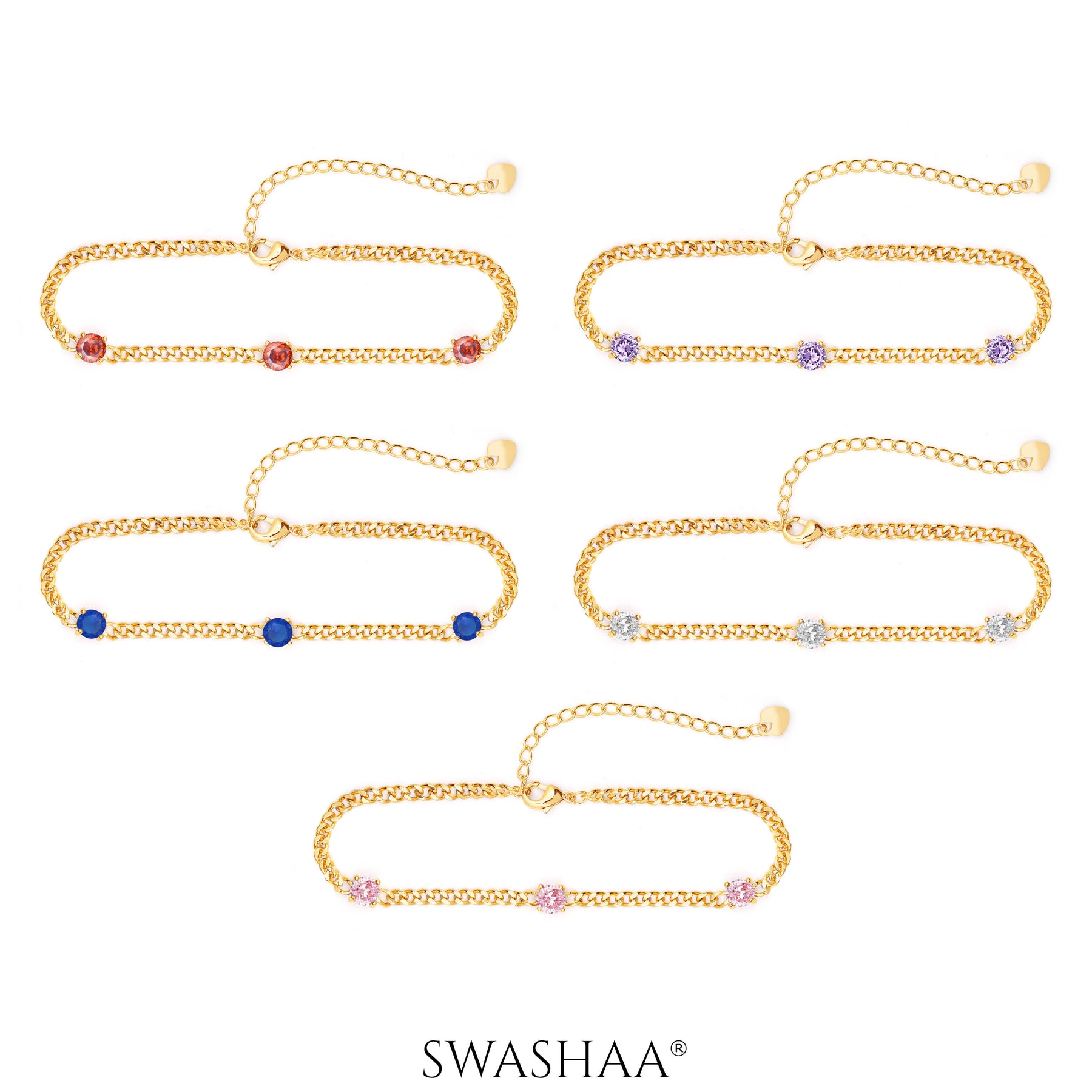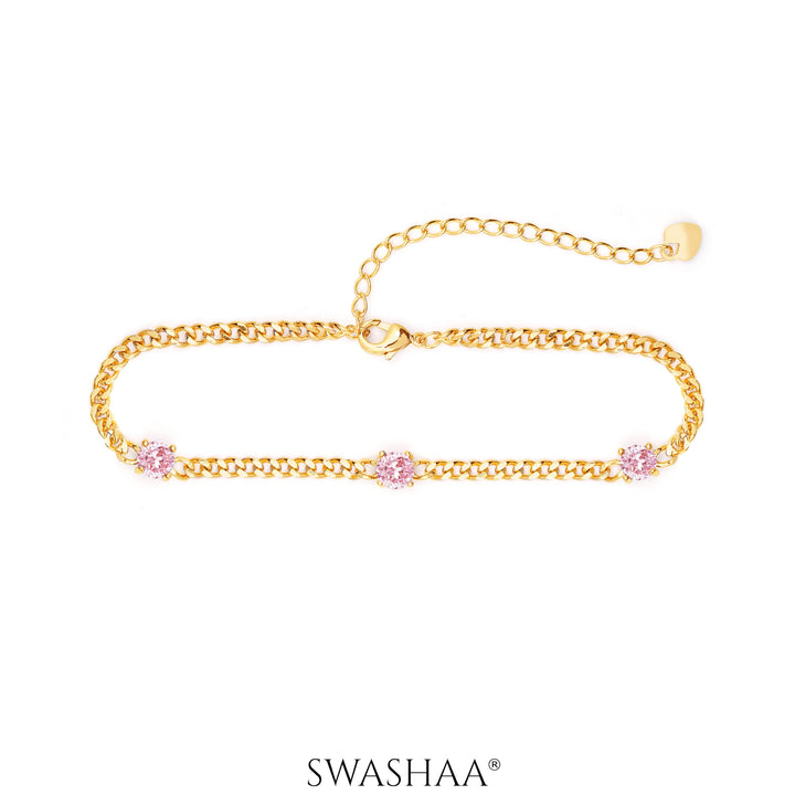 Minimal gold chain bracelet accented with three round-cut CZ stones in prong settings. Features a lobster clasp and extender chain - refined, radiant, and perfect for stacking or solo sparkle.