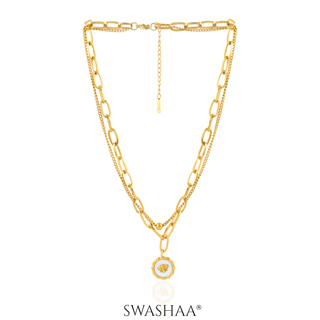 Dual-chain gold-tone necklace featuring textured links and a circular bee pendant with a white enamel center. Detailed, radiant, and designed for effortless layering with a touch of charm.