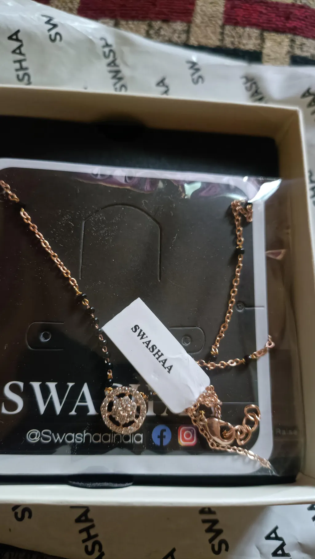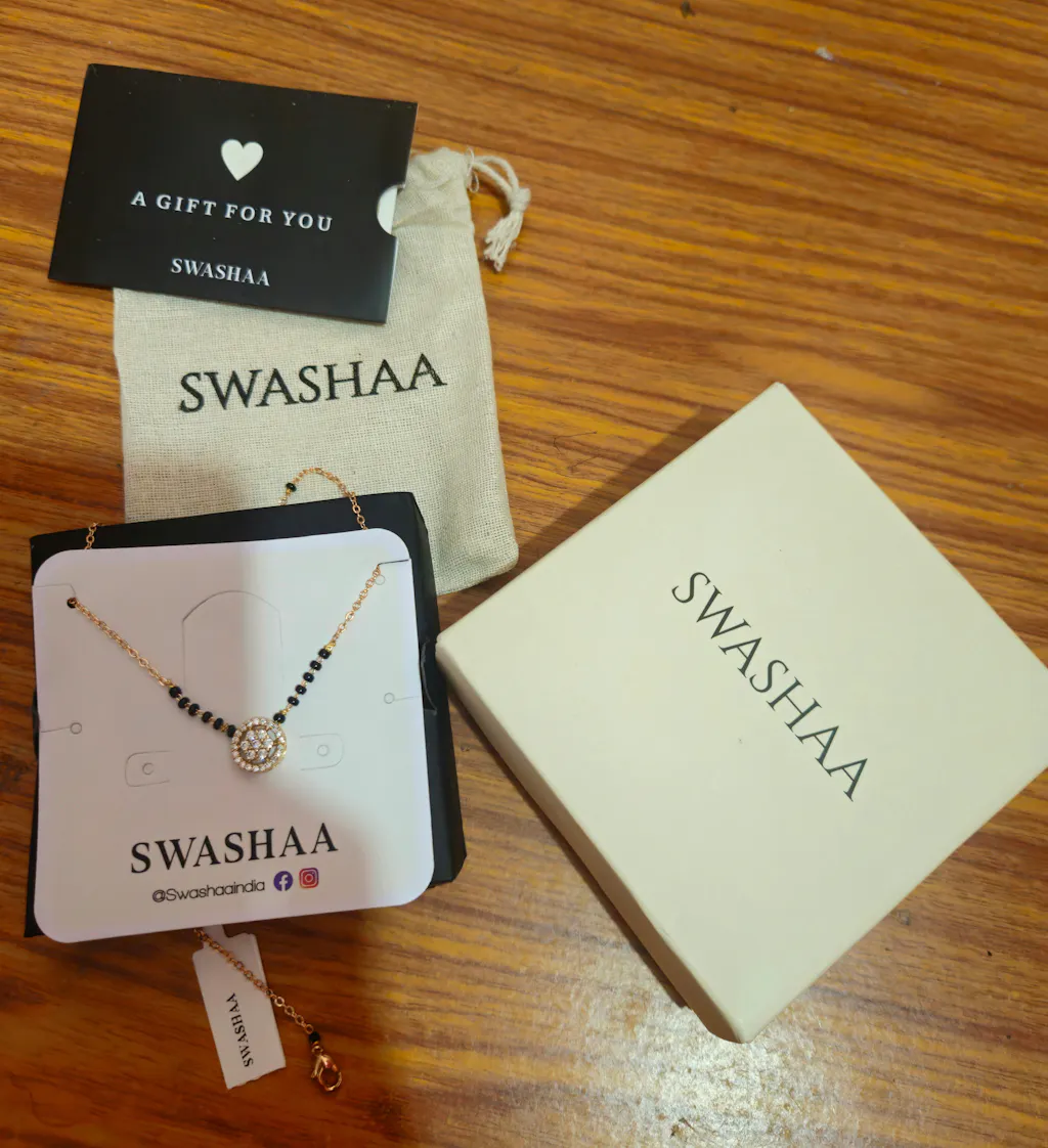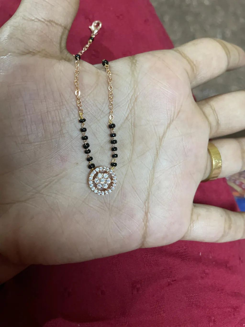 A circular pendant encrusted with fine CZ stones rests on sleek rose gold chains detailed with black beads. Subtle yet striking, this mangalsutra captures the essence of modern devotion with effortless charm.